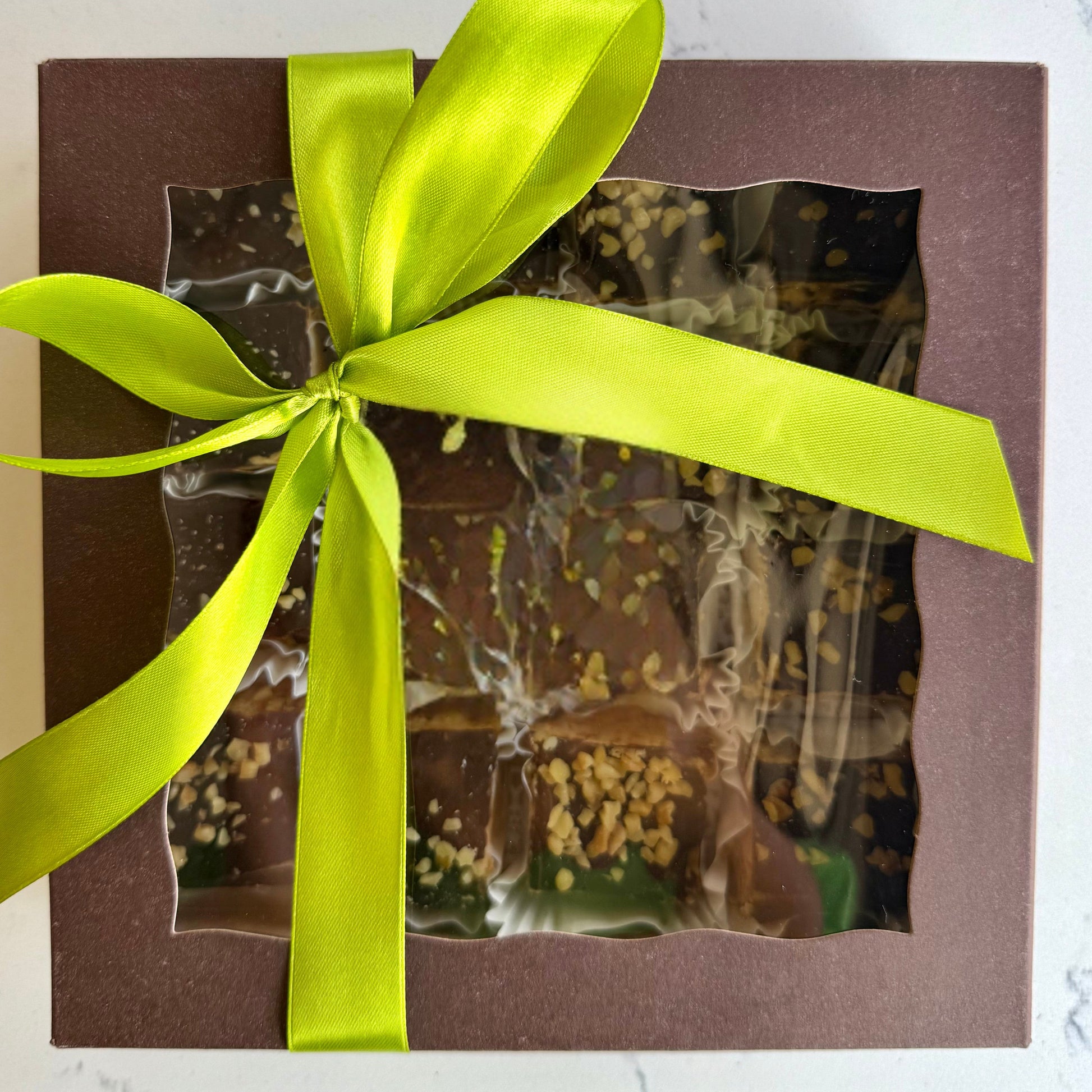 Each bar is dipped in a luscious dark chocolate coating and finished with a sprinkle of chopped walnuts for that final touch of texture and flavor.
